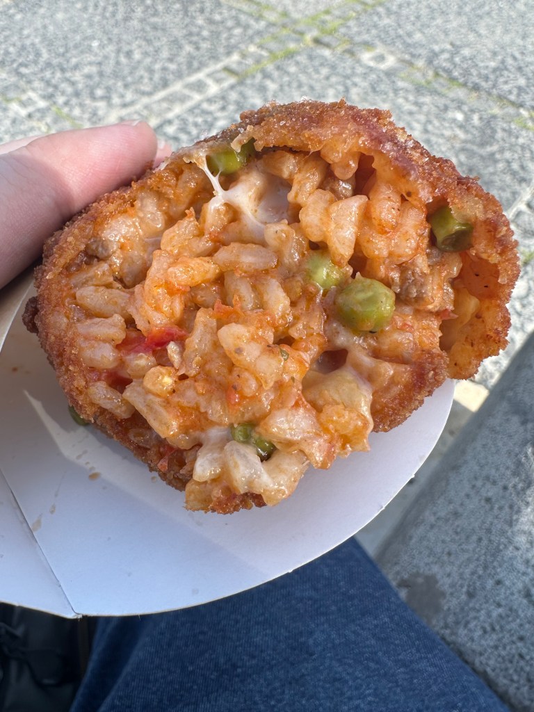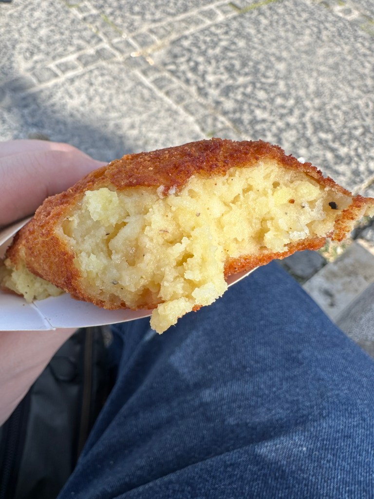 Lunch was from a really small local place called Na’ Pasta and I cannot recommend it enough! For 6 Euros I was able to get a Coke, an Arancina, and a crocche di patate. The Arancina is a fried ball of rice, peas and ham. The crocche di patate is a fried ball of mashed potatoes, salami and mozzarella. They cook them right away so they are fresh and hot. A fantastic light lunch on the go!